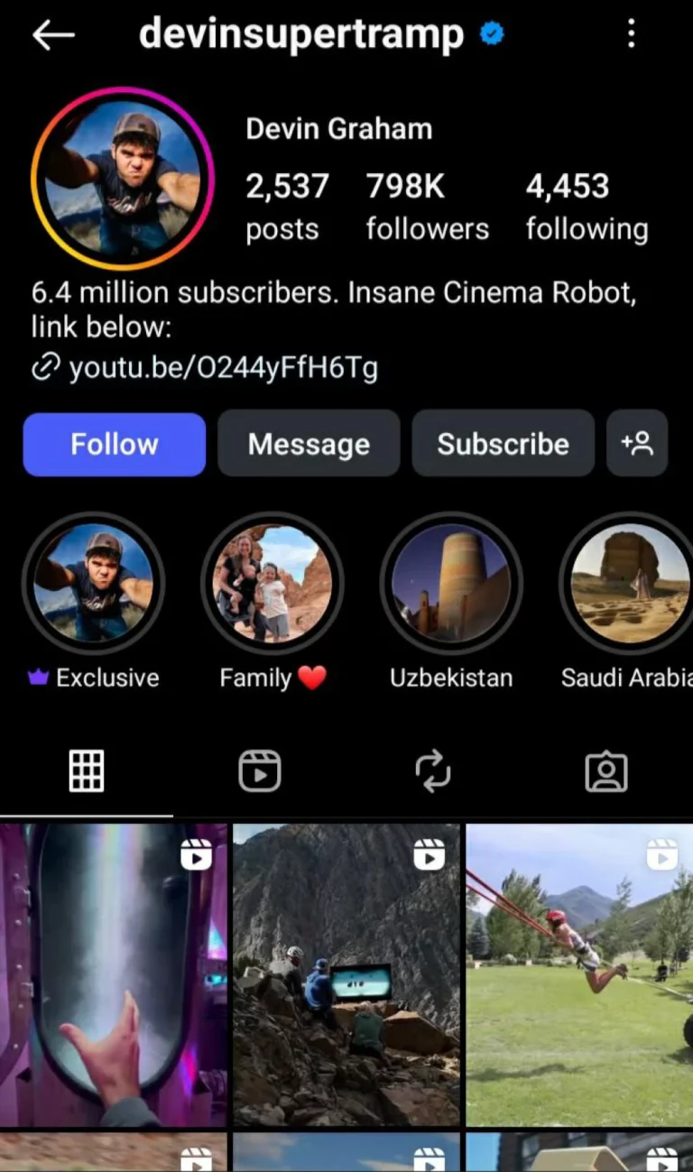 Videographer Devin Graham posts videos of himself capturing moments for his action films like this one of him and his actors jumping and running across rooftops.